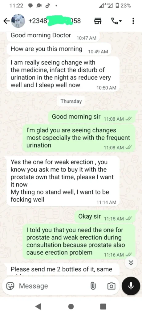 He took my sample and I was asked to come back for my result after some days i got my result and my PSA was around 15 as against the normal& i became so worried and i explained this to my wife and my mom, in the process of talking, my mom interrupted me and told me how surgery was done on my dad and he has to live on diapers before passing on and then she narrated how my uncle also passed on after battling with prostate enlargement which lead to blockage and other complications&. he was placed on catether but couldnt live on it for long